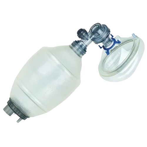 Einweg-Beatmungsbeutel aus PVC im Set mit Luftwulstmaske, O2-Reservoir und O2-Leitung.