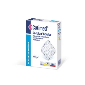 Cutimed® Sorbion® Border ist ein selbsthaftender Superabsorber zur Ver sorgung von mäßig bis übermäßig stark exsudierenden Wunden. Der hautfreundliche Silikon-Haftrand von Cutimed® Sorbion® Border sorgt für eine sichere Fixierung mit maximaler Schonung der Wundumgebungshaut. Dies bietet dem Patienten einen atraumatischen Verbandwechsel sowie eine einfache Repositionierbarkeit der Wundauflage. Seine hoch atmungsaktive Deckfolie unterstützt zudem das feuchtes Wundmilieu und fördert die Wundheilungsbedingungen. Cutimed® Sorbion® Border kommt überall dort zum Einsatz, wo eine schnelle und einfache Applikation erforderlich ist, ohne auf die bewährten Vorzüge von Cutimed® Sorbion® mit seinem effektiven leistungsstarken Exsudatmanagement zu verzichten. Vorteile Cutimed® Sorbion® Border besteht aus einem stark wasserhaltenden, superabsorbierenden Kern, der von einer Wundkontaktschicht aus einem hypoallergenen Polypropylenvlies umhüllt ist, und einem stark haftenden, sanften Silikon-Haftrand. Die atmungsaktive, wasserdichte Rückseite ist aus Polyurethan und ermöglicht das Duschen. Nicht mit Naturkautschuklatex hergestellt