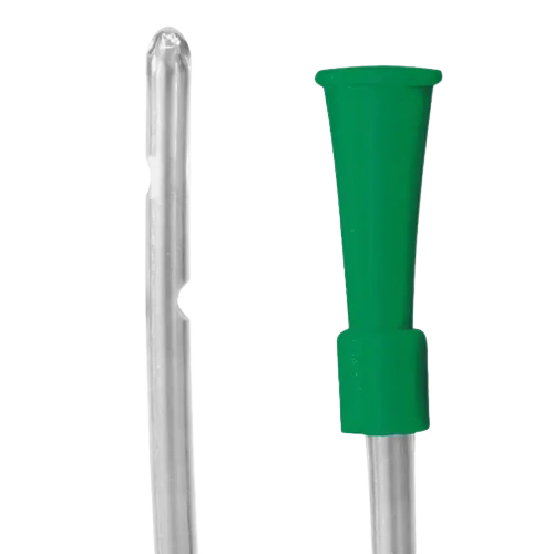 Mit Trichter, farblich nach Charr.-Größen codiert, besonders weiche, satinierte Oberfläche = geringstes Trauma der Schleimhäute, atraumatische, seitliche Augen mit Lumen der Charr.-Größe entsprechend, weiche abgerundete Spitze des Katheters.