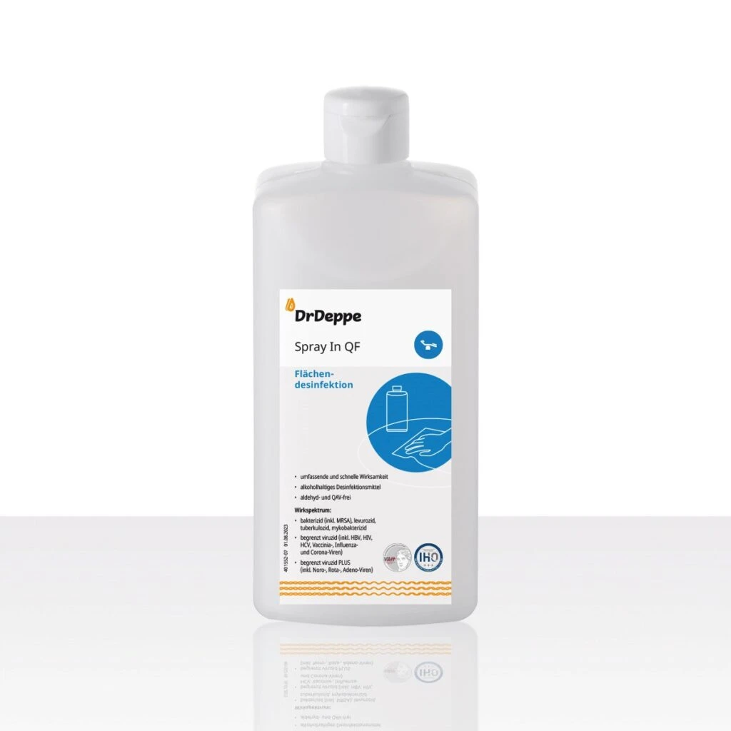 Spray In QF ist ein flüssiges, alkoholisches, aldehyd- und QAV-freies Flächendesinfektionsmittel in gebrauchsfertiger Form.