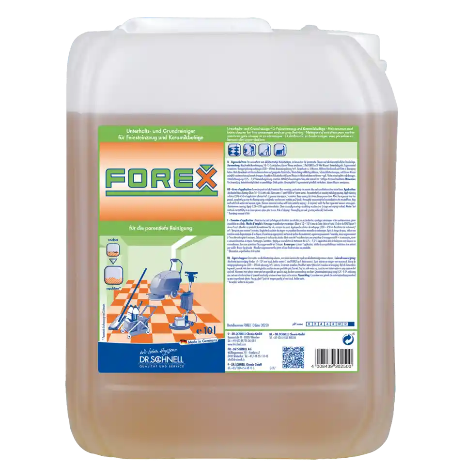 Maschinelle Grundreinigung_x000D_FOREX 10 %ig mit kaltem, klarem Wasser verdünnen (1 Teil FOREX auf 9 Teile Wasser). Bodenbelag inkl. Fugenmaterial mit reichlich kaltem, klarem Wasser vorwässern. Anschließend reichlich Reinigerlösung auf den Boden ausbringen (500 – 650 ml Anwendungslösung/m²). Einwirkzeit ca. 5 Minuten. Während der Einwirkzeit Flotte manuell oder maschinell in Bewegung halten. Nach Einwirkzeit mit Einscheibenmaschine und geeigneter Padscheibe/Bürste Belag vollflächig abfahren, bearbeitete Bodenfläche gründlich absaugen. Bodenbelag gründlich (ggf. mehrmals) mit klarem Wasser nachwaschen und erneut absaugen. Angelöste Rückstände mit klarem Wasser im Wischverfahren von der Fläche entfernen – bei Bedarf Fläche spülen und mit Wassersauger aufnehmen._x000D_Unterhaltsreinigung_x000D_0,25 – 5,0 % Anwendungslösung ansetzen. Mittels Scheuersaugmaschine oder manuell im 2-stufigen Nasswischverfahren zur Anwendung bringen.