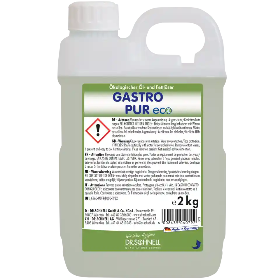 GASTRO PUR ECO in Abhängigkeit vom Schmutzaufkommen dosieren._x000D_• Zur Reinigung großer Flächen 0,1-1,0 %_x000D_• Bei besonders starken Verschmutzungen, Dosierung ggf. bis 25 % erhöhen