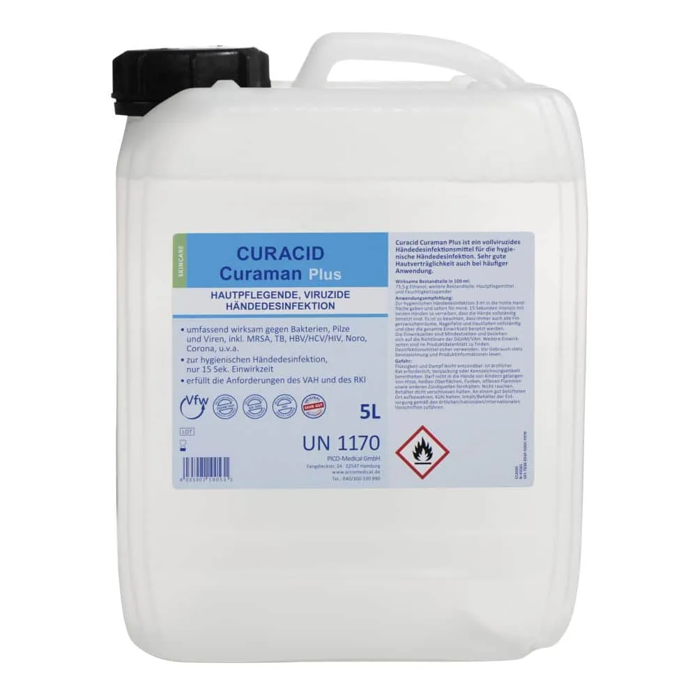 Händedesinfektion Curacid® Curaman Plusbakterizid und fungizid nach EN 1500 entsprechend den Anwendungsempfehlungen des VAHEinwirkungszeit 15 Sekunden/3mlviruzid nach EN 14476auch wirksam gegen MRSA, Norovirus, Adenovirus und Poliovirenbegutachtet nach EN 1500 (hygienische Händedesinfektion)begutachtet nach EN 14476 (Viruzide)gute Hautverträglichkeit durch hochwertige RückfetterRegelmäßige und gründliche Desinfektion der Hände ist sowohl im Pflegebereich als auch in der Lebensmittelindustrie von besonderer Bedeutung. Curacid® Curaman Plus ist eine schnellwirkende, alkoholische Händedesinfektion mit erhöhter Viruswirksamkeit. Der hohe Anteil an Ethanol (80%) ermöglicht eine sehr gute Wirksamkeit gegen Noro-Viren. Das Desinfektionsmittel ist anwendbar in allen Bereichen der menschlichen Hygiene.