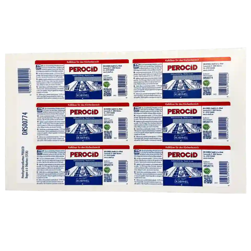 Selbstklebende PEROCID Handsprüher Etiketten, die zum eigenständigen Um- und Neuetikettieren der Handsprüher verwendet werden können.
