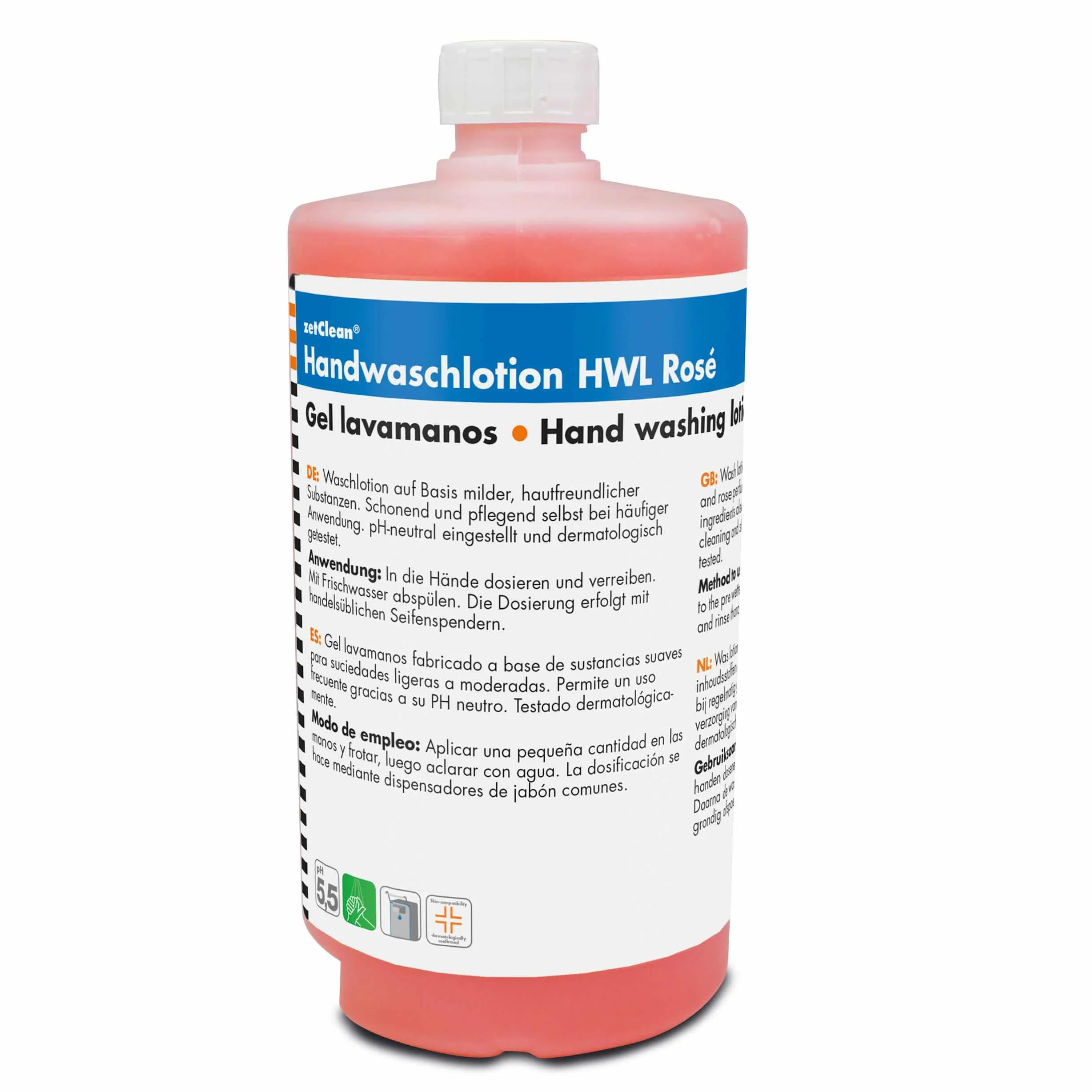 Handwaschlotion HWL RoséHandwaschlotion HWL Rosé ist eine milde Cremeseife für die hygienische Händewaschung. Sie basiert auf hautfreundlichen, rückfettenden und pflanzlichen Wirkstoffen. Aufgrund der schonenden und speziell pflegenden Substanzen für häufige Anwendungen sehr gut geeignet. Unsere Flüssigseifen sind besonders hautfreundlich und besonders für die Anwendung bei leicht verschmutzten Händen geeignet.dermatologisch getestetpH-neutralmit rückfettenden, pflanzlichen Wirkstoffenauch bei häufiger Anwendung hautschonend und verträglichauch für Körperwaschungen einsetzbarfür alle gängigen Druckspendersysteme geeignetIn unserem zetMatic®-Sortiment finden Sie mit Sicherheit das ideale Spendersystem.Achtung: Produkte für die hygienische Händewaschung ersetzen nicht die alkoholischen Präparate zur Händedesinfektion! Besonders nach keimbelasteten Arbeitsvorgängen und im Bereich der Lebensmittelverarbeitung empfehlen wir den Einsatz einer desinfizierenden Waschlotion.