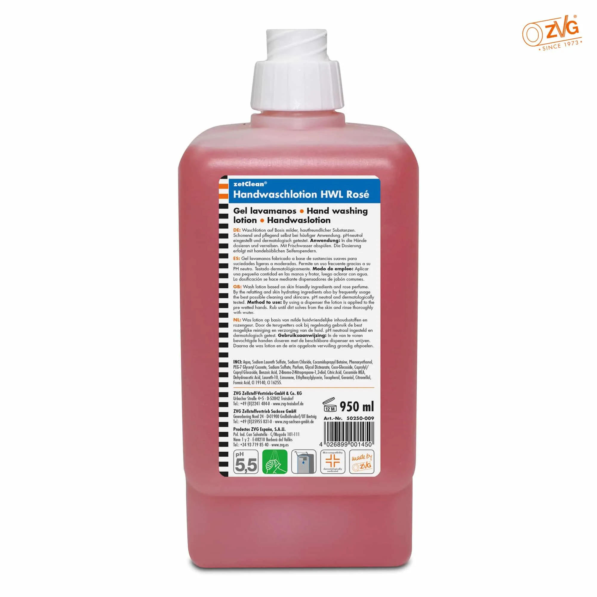 Handwaschlotion HWL RoséHandwaschlotion HWL Rosé ist eine milde Cremeseife für die hygienische Händewaschung. Sie basiert auf hautfreundlichen, rückfettenden und pflanzlichen Wirkstoffen. Aufgrund der schonenden und speziell pflegenden Substanzen für häufige Anwendungen sehr gut geeignet. Unsere Flüssigseifen sind besonders hautfreundlich und besonders für die Anwendung bei leicht verschmutzten Händen geeignet.dermatologisch getestetpH-neutralmit rückfettenden, pflanzlichen Wirkstoffenauch bei häufiger Anwendung hautschonend und verträglichauch für Körperwaschungen einsetzbarfür alle gängigen Druckspendersysteme geeignetIn unserem zetMatic®-Sortiment finden Sie mit Sicherheit das ideale Spendersystem.Achtung: Produkte für die hygienische Händewaschung ersetzen nicht die alkoholischen Präparate zur Händedesinfektion! Besonders nach keimbelasteten Arbeitsvorgängen und im Bereich der Lebensmittelverarbeitung empfehlen wir den Einsatz einer desinfizierenden Waschlotion.