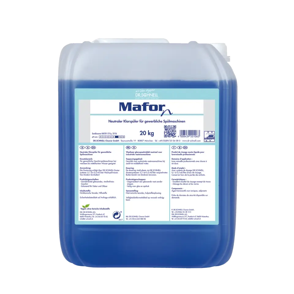 MAFOR N Hochleistungsklarspüler für alle gewerblichen Spülmaschinen. Optimale_x000D_Spülergebnisse bei weichem bis mittelhartem Wasser. Zur exakten Dosierung_x000D_empfehlen wir die Zugabe zur Spülflotte über ein DR.SCHNELL-Dosiergerät.