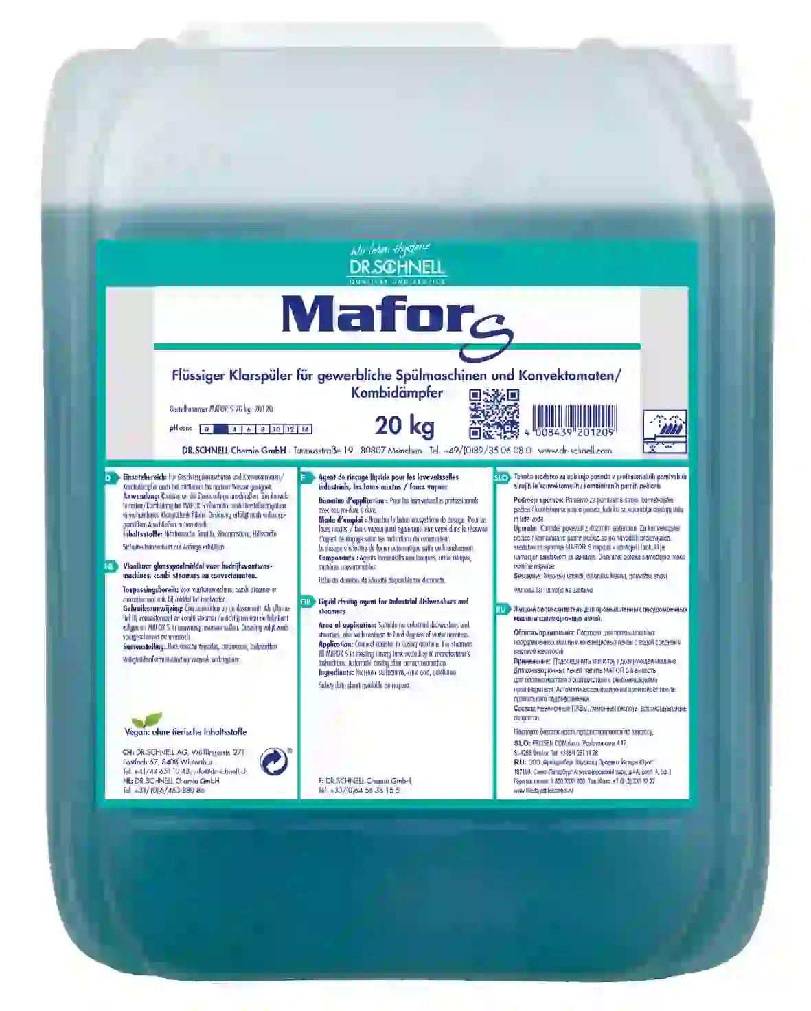 MAFOR S Universalklarspüler für alle gewerblichen und Haushaltsspülmaschinen. Optimale Spülergebnisse auch bei hartem Wasser. Zur exakten Dosierung empfehlen wir die Zugabe zur Spülflotte über ein DR.SCHNELL- Dosiergerät. In Kombination mit CONVECTOR auch zur Reinigung von Konvektomaten und Kombidämpfer geeignet.