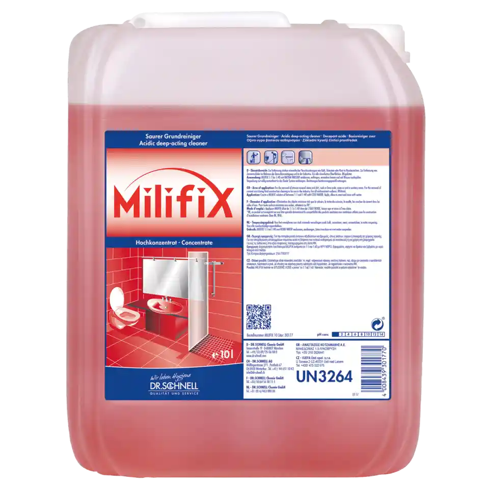MILIFIX pur bis 5 % mit kaltem, klarem Wasser verdünnen, auftragen, einwirken lassen und mit kaltem, klarem Wasser nachspülen. Sehr gut für den Einsatz mit der DR.SCHNELL Schaumkanone_x000D_geeignet. Zur Grundreinigung von Toilettenschüsseln/Urinalen MILIFIX konzentriert unter dem Rand der Toilettenschüssel/dem Urinal ausbringen, mit Toilettenbürste bearbeiten und nach kurzer Einwirkzeit spülen._x000D_Bitte beachten: Vor Ausbringung Toilettensitz komplett hochklappen.