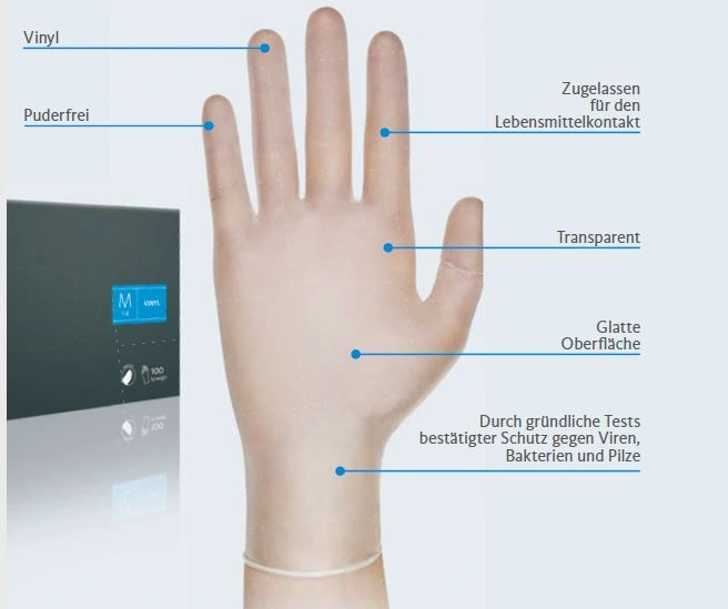 Vinyl ist eines der PVC-Werkstoffe. Polyvinylchlorid (PVC) findet dank seiner Eigenschaften in vielen Industriezweigen breite Anwendung. Vinylhandschuhe sind hautfreundlich für Anwender, die zu Typ-I- und Typ-IV-Allergien neigen.