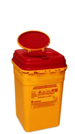 Entsorgungsbehälter, Multi-Safe euroMatic®, 4.000 ml, gelb, eckig, mit Kunststoffetikett, Etikett/Druck: gelb/rot, Material: PP, Öffnung: oval, Höhe: 245 mm, Automatikverschluss, Deckel (LxB): 164 x 164 mm, Verschluss: rot, TRBA 250, UN 3291, DIN EN ISO 23907, 50 Stück/Karton