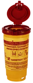 ArtikelbeschreibungEntsorgungsbehälter, Multi-Safe twin plus, 500 ml, gelb, rund, mit Kunststoffetikett, Etikett/Druck: gelb/rot, Material: PP, Anwendung z.B.: Entsorgung von spitzen und scharfen Gegenständen, Öffnung: oval, Höhe: 162 mm, Ø Deckel: 89 mm, Verschluss: rot, TRBA 250, UN 3291, DIN EN ISO 23907, 126 Stück/Karton