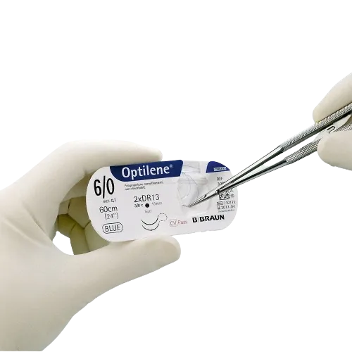 OPTILENE ist ein Nahtmaterial mit der Fadenstärke USP 6/0 (metrisch 0,7). Der Faden ist blau gefärbt. Die Nadel hat den Typ 2XDRC10 und eine Länge von 75 mm.
