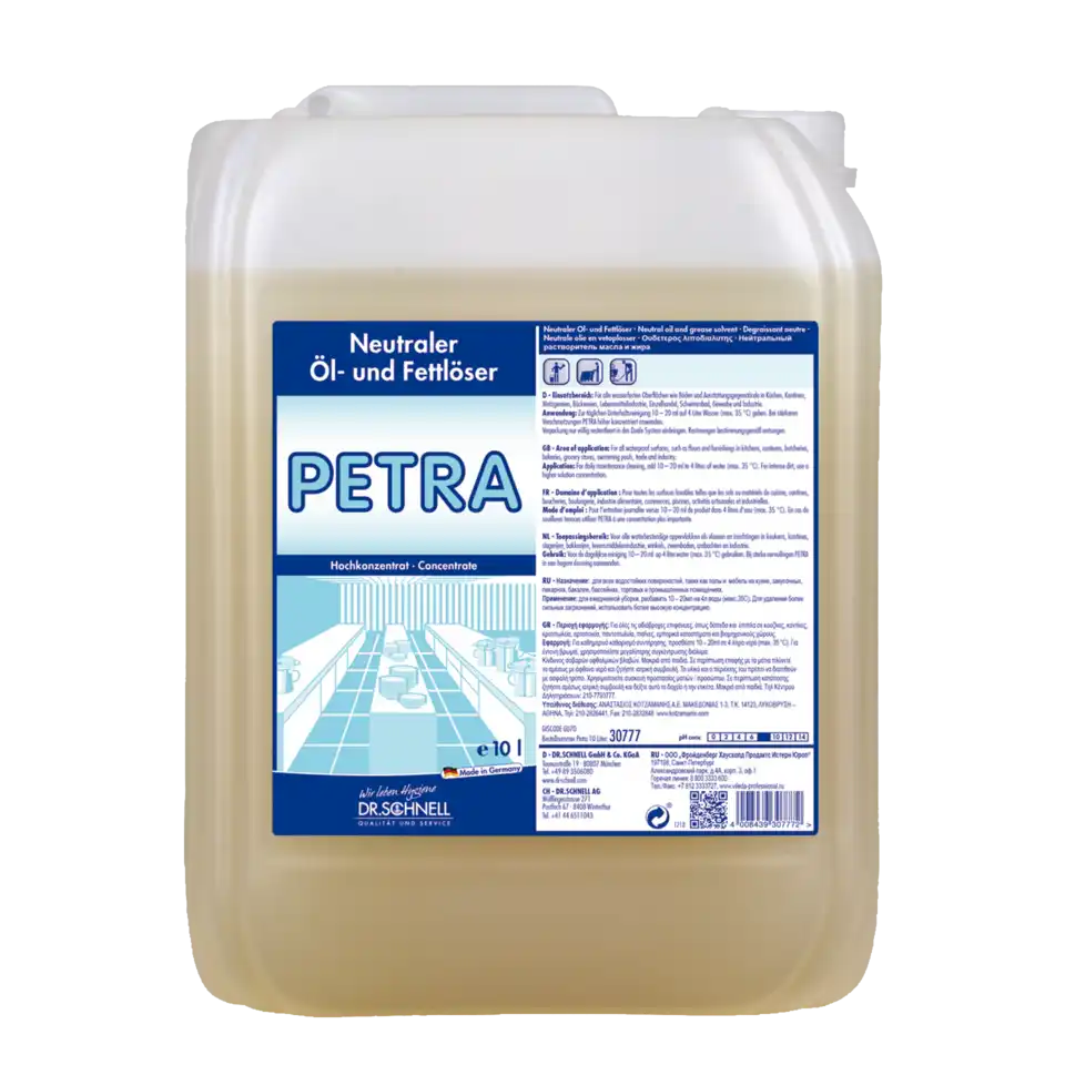 PETRA abhängig vom Verschmutzungsgrad dosieren_x000D_• Zur Reinigung großer, wenig verschmutzter Flächen genügen 10 ml auf 4 Liter Wasser (0,25 %)_x000D_• Zur Reinigung stark verschmutzter, verfetteter Oberflächen höher konzentriert anwenden und nachwischen