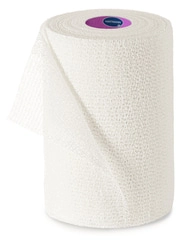 Kohäsive, elastische Fixierbinden mit zweifachem Hafteffekt durch gekreppte Gewebestruktur und mikropunktuelle Imprägnierung mit einem Synthetik-Polymer, Dehnbarkeit ca. 85 %, geringer Materialverbrauch durch starke Eigenhaftung, bereits wenige Touren ergeben eine sichere, dauerhafte Fixierung, dabei kein Verkleben mit Haut, Haaren oder Kleidung, luftdurchlässig, hautfreundlich und geruchsneutral, da acrylat- und chlorfrei.