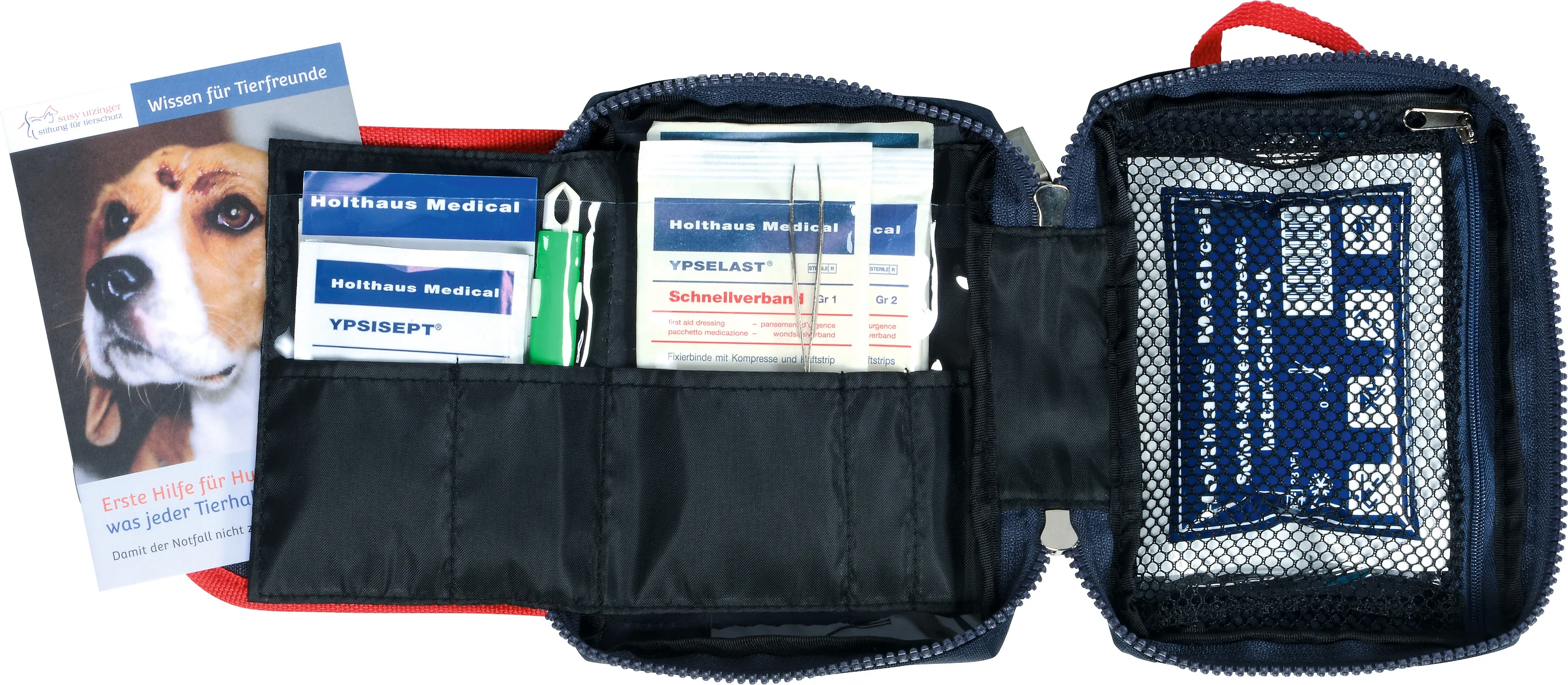 Eine speziell auf Verletzungen bei Kleintieren abgestimmte Erste-Hilfe-Broschüre rundet den Inhalt der Verbandtasche ab.