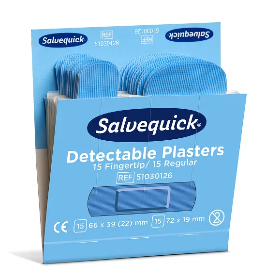 Salvequick Blue Detectable Pflaster sind insbesondere für den Einsatz in der Lebensmittelbranche bestimmt. Die detektierbaren Pflaster werden von den meisten Metalldetektoren erkannt. Die blaue Farbe macht die Pflaster leicht sichtbar. Auf Allergien getestet. Leicht aufzukleben, flexibel und praktisch. Die Wunde reinigen. Darauf achten, dass sie nicht infiziert ist. Das Pflaster täglich wechseln.