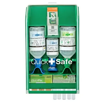 Wandbox aus schlagfestem Kunststoff mit transparentem Klappdeckel inkl. 1 x 500 ml Augenspülflasche DUO mit steriler 0,9 % Natriumchloridlösung zum gleichzeitigen Spülen beider Augen, 1 x 200 ml Augenspülflasche pH Neutral ,1 x 500 ml Augenspülflasche pH Neutral DUO zum gleichzeitigen Spülen beider Augen bei Verätzungsgefahr durch Säuren und Alkali, 5 Stk. QuickRinse 20 ml Augenspülampullen, 1 QuickFix Pflasterrefill mit 45 Stk. elastischen Pflastern. Lieferung inkl. Anwendungshinweisen und Befestigungsmaterial. Mit separater Piktogrammtafel mit Spiegel.