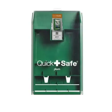 Wandbox aus schlagfestem Kunststoff mit transparentem Klappdeckel, Lieferung ohne Inhalt zum Selbstbefüllen der QuickSafe Box mit den 200 ml und 500 ml Plum Augenspülflaschen und Erste-Hilfe Produkten. Lieferung inkl. Anwendungshinweisen und Befestigungmaterial. Mit separater Piktogrammtafel mit Spiegel.