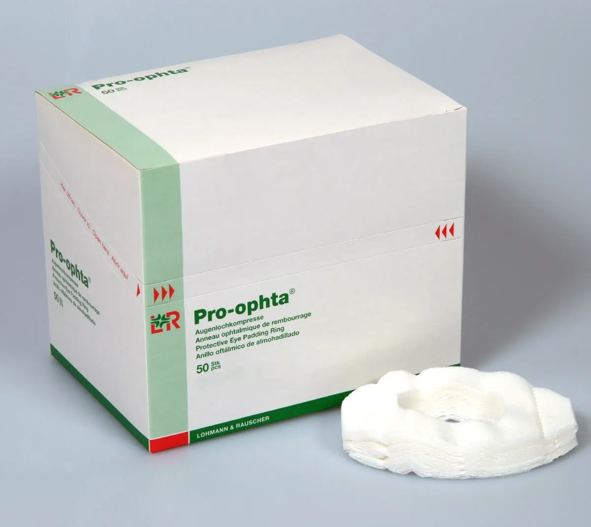 Nach intraokularen Eingriffen gilt es, das Auge vor mechanischen Reizen zu schützen. Hier steht die Pro-ophta Augenlochkompresse zur Verfügung, die unter einer gelochten Augenscheibe verwendet wird. Der Vorteil: Die natürliche Lidfunktion bleibt erhalten und das Auge wird weiterhin gut mit Luft versorgt. Insbesondere bei der Versorgung nach Kataraktoperationen, Lidoperationen oder bei Verletzungen am äußeren Auge bietet sich die Augenlochkompresse an. Dabei ist die Kompresse samtweich, fusselarm, nimmt Flüssigkeit auf und polstert die Augenumgebung gut. In Verbindung mit einer transparenten Augenlochscheibe kann der Patient mit der gelochten Kompresse schon früh erste Sehversuche unternehmen — ein Plus für die Therapieakzeptanz.