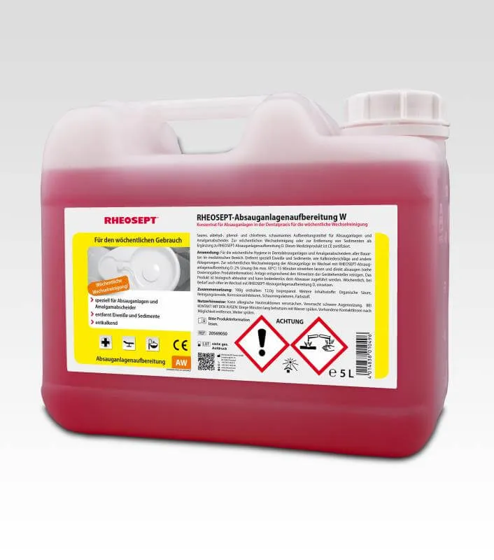 Saures, aldehyd-, phenol- und chlorfreies, schaumarmes Aufbereitungsmittel für Absauganlagen und Amalgamabscheider. Zur wöchentlichen Wechselreinigung oder zur Entfernung von Sedimenten als Ergänzung zu RHEOSEPT-Absauganlagenaufbereitung D. Dieses Medizinprodukt ist CE zertifiziert.