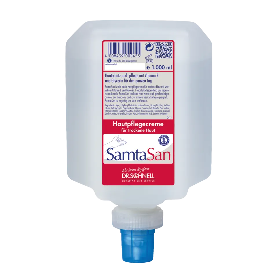 SAMTASAN ist schnell einziehend und silikonfrei, sie pflegt trockene und strapazierte Haut mit wertvollen Substanzen und schützt die Haut vor dem Austrocknen. Vitamin E und Glycerin spenden intensive Feuchtigkeit und glätten die Haut._x000D_ SAMTASAN ist perfekt auf die Bedürfnisse der strapazierten, trockenen und rissigen Haut nach der Arbeit abgestimmt, sie ist reichhaltig und zieht schnell ein ohne nachzufetten.
