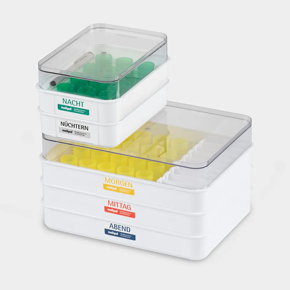 für 20 Bewohner kompletter Satz melipul Becher-Tabletts mit variablen Fächern VF zur Organisation und Ausgabe der Bewohnermedikamente bestehend aus: 3 Becher-Tabletts 20x1 VF-35 je 1x für MORGEN / MITTAG / ABEND 2 Becher-Tablett 12x1-25 für NÜCHTERN / NACHT 1 Stapeldeckel 25 und 1 Stapeldeckel 35 mit Tablett-Einsätzen Beschriftungsfolien verschiebbarem Teilersystem Folienstift und Mehrwegbechern in den Farben: Nüchtern = braun Morgen = gelb Mittag = rot Abend = blau Nacht = grünMaße: L 353 x B 253 x H 345 mm