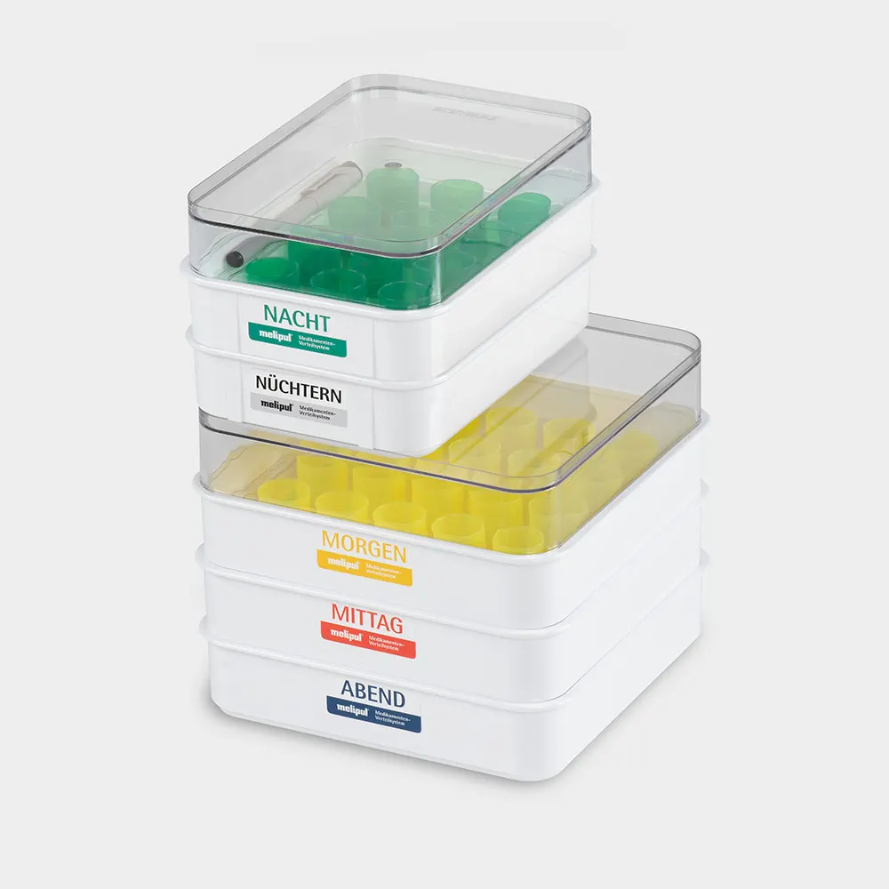Kompletter Satz melipul Becher-Tabletts zur Organisation und Ausgabe der Bewohnermedikamente für 20 Bewohner bestehend aus: 3 Becher-Tabletts 20x1-26 je 1 x für MORGEN / MITTAG / ABEND 2 Becher-Tablett 12x1-25 für NÜCHTERN / NACHT 1 Stapeldeckel 26 und 1 Stapeldeckel 26 mit Tabletteinsätzen Beschriftungsfolien Folienstift und Mehrwegbecher in den Farben: nüchtern = braun morgen = gelb mittag = rot abend = blau nacht = grünMaße: L 253 x B 253 x H 345 mm