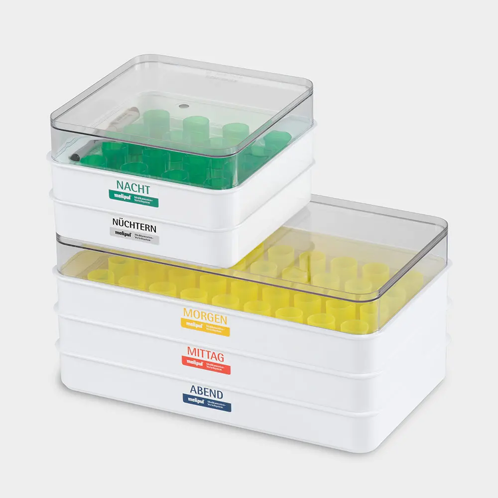 für 36 Bewohner kompletter Satz melipul Becher-Tabletts zur Organisation und Ausgabe der Bewohnermedikamente bestehend aus: 3 Becher-Tabletts 36x1-43 je 1x für MORGEN / MITTAG / ABEND 2 Becher-Tablett 16x1-26 für NÜCHTERN / NACHT 1 Stapeldeckel 26 und 1 Stapeldeckel 43 mit Tablett-Einsätzen Beschriftungsfolien Folienstift und Mehrwegbechern in den Farben: Nüchtern = braun Morgen = gelb Mittag = rot Abend = blau Nacht = grünMaße: L 433 x B 253 x H 345 mm