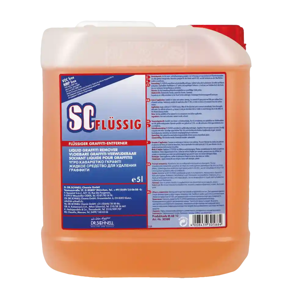 SC FLÜSSIG unverdünnt und gleichmäßig auftragen. Löseprozess überwachen._x000D_Nach Einsetzen des Löseprozesses Graffiti ggf. mit geeigneter Mechanik bearbeiten. _x000D_Gelöste Farbe sofort gründlich entfernen._x000D_Als letzten Schritt gereinigte Fläche mit reichlich Wasser nachspülen._x000D_Empfindliche Oberflächen wie z.B. Lacke nach der Reinigung mit saugfähigen Tüchern o. Ä. trocknen, um Schäden durch nachträgliches Einwirken des Reinigers zu vermeiden._x000D_Arbeitsschritte wenn nötig wiederholen, bis das gewünschte Ergebnis erreicht ist._x000D_