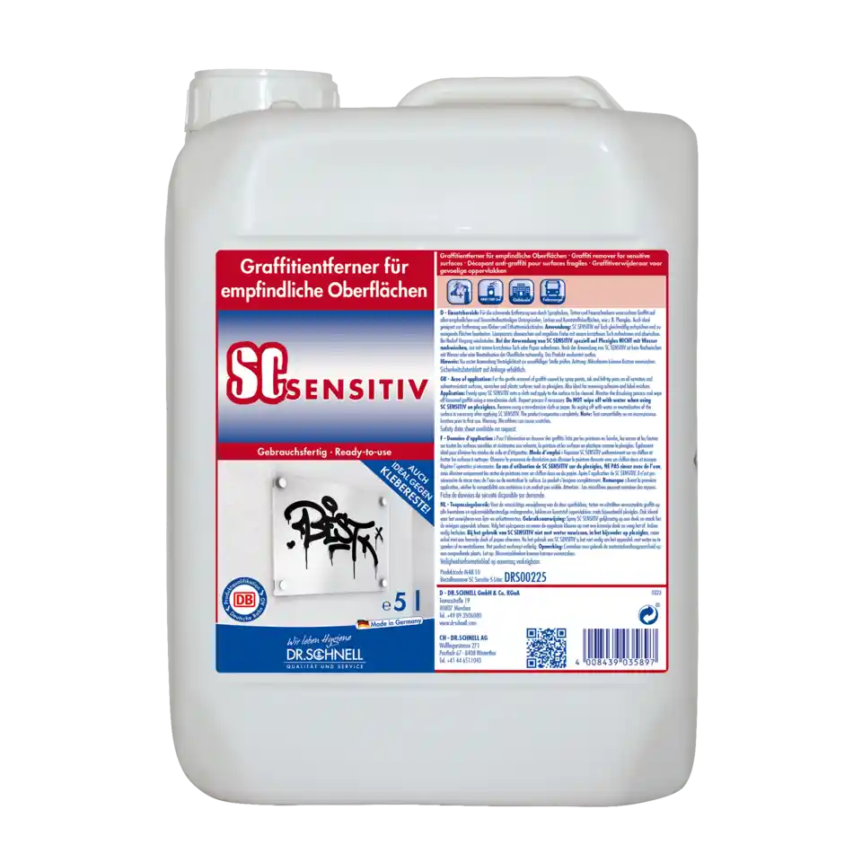 SC SENSITIV auf Tuch gleichmäßig aufsprühen und zu reinigende Flächen bearbeiten._x000D_Löseprozess überwachen und angelöste Farbe mit einem kratzfreien Tuch aufnehmen und abwischen. Bei Bedarf Vorgang wiederholen._x000D_Bei der Anwendung von SC SENSITIV speziell auf Plexiglas NICHT mit Wasser nachwischen, nur mit einem kratzfreien Tuch oder Papier aufnehmen. Nach der Anwendung von SC SENSITIV ist kein Nachwischen mit Wasser oder eine Neutralisation der Oberfläche notwendig. Das Produkt verdunstet restlos._x000D_