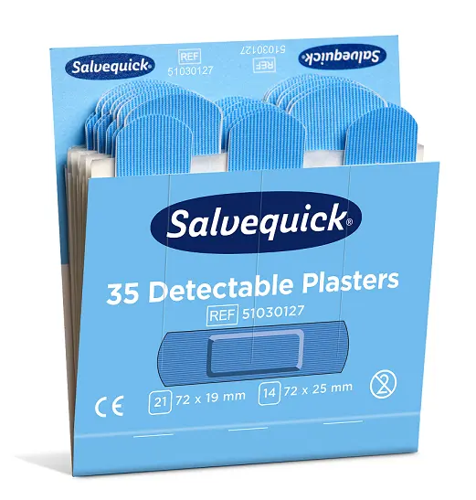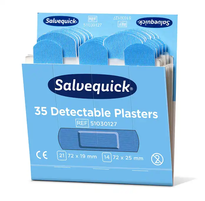 Die Salvequick Detectable Wundverbände werden von den gängigsten Metalldetektoren erkannt, und durch die blaue Farbe sind sie leicht visuell erkennbar, wodurch die Pflaster besonders geeignet für Restaurants und die Lebensmittelindustrie sind. Die Pflaster lassen sich leicht mit nur einer Hand herausziehen und auf der Wunde anordnen.