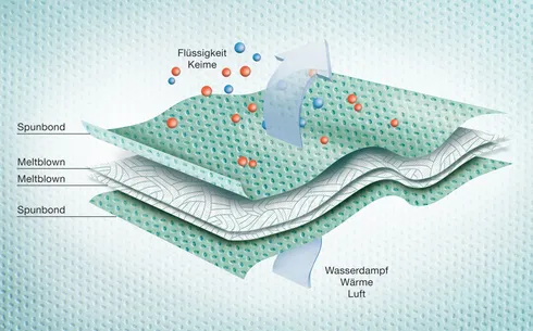 SMMS-Material ist sehr leicht und schützt trotzdem zuverlässig vor Bakterien und Flüssigkeiten. Es gewährleistet die Zirkulation von Luft, Wärme sowie Wasserdampf und reduziert thermophysiologische Belastungen.