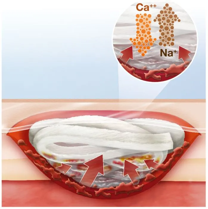 Bei der Aufnahme von Wundexsudat werden Natriumionen mit Calciumionen ausgetauscht und so ein Gel erzeugt. In dieses Gel werden Bakterien und Zelltrümmer eingeschlossen und ein feuchtes Wundklima aufrechterhalten.