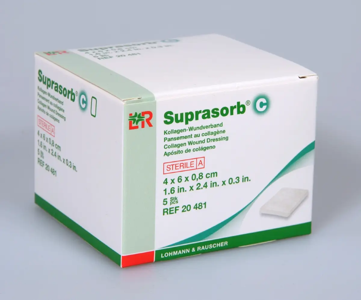 Der Suprasorb C Kollagen-Wundverband besitzt eine poröse Struktur mit sehr ausgeprägter Kapillaraktivität und damit die Fähigkeit zur Flüssigkeitsaufnahme. Durch diese physikalische Eigenschaft werden mit der kontinuierlichen Absorption des Exsudats Zelltrümmer (wie abgestoßene Nekrosen, Fibrinbeläge) sowie entzündungsinduzierende Proteasen und Zytokine aufgenommen. Dies fördert und beschleunigt die Bildung des Granulationsgewebes. Die Einwanderung von Fibroblasten wird induziert und die Kollagensynthese angeregt. Durch die kontinuierliche Versorgung des Defekts mit hochwertigem Kollagen während der Granulations- und zu Beginn der Epithelisierungsphase wird die Neubildung körpereigener Kollagenfibrillen und -fasern unterstützt. Durch den Aufbau des Wundgrundes werden die notwendige Proliferation und die Migration der epidermalen Zellen gefördert. Dies unterstützt die Wundheilung. *