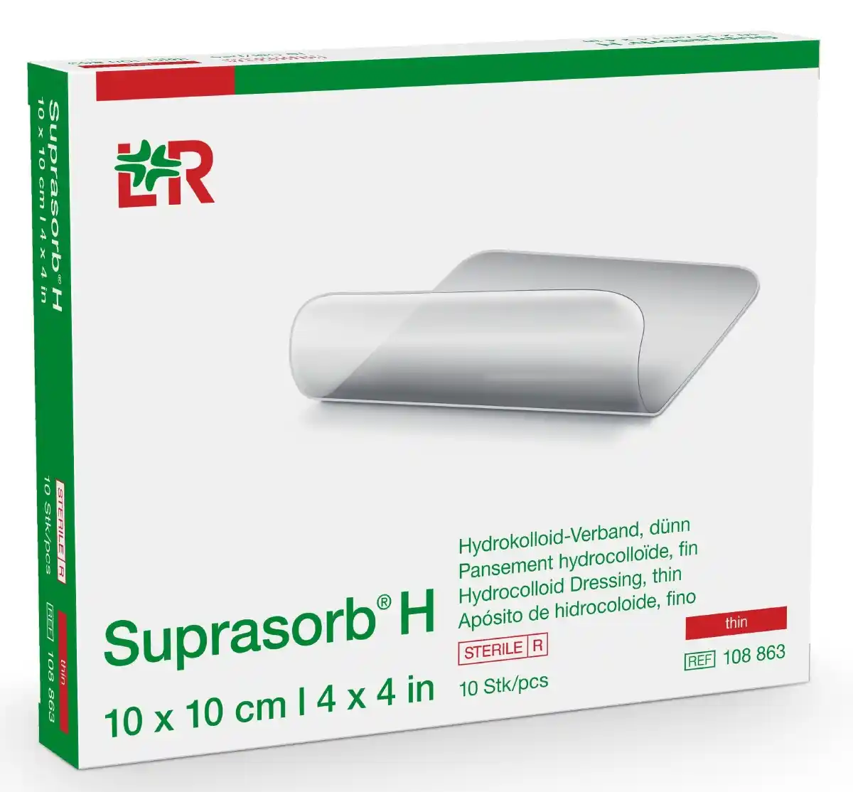 Der Suprasorb H Hydrokolloid-Verband besteht aus einer absorbierenden Hydrokolloid-Matrix, die auf eine atmungsaktive Polyurethan-Trägerfolie aufgebracht ist. Die Hydrokolloid-Matrix absorbiert Exsudat schnell und bildet ein kohäsives Gel. Zusätzlich zur ausgezeichneten Absorptionsfähigkeit bietet die atmungsaktive Polyurethan-Trägerfolie eine hohe Wasserdampfdurchlässigkeit. Die Kombination dieser Eigenschaften gewährleistet eine optimale feuchte Wundumgebung, minimiert das Risiko für Schädigungen der gesunden Wundumgebungshaut und bietet eine Tragezeit von bis zu sieben Tagen. Aufgrund der verschiedenen Ausführungen von Suprasorb H (Standard, Dünn, Sakrum, Border) können verschiedene Indikationen versorgt werden.