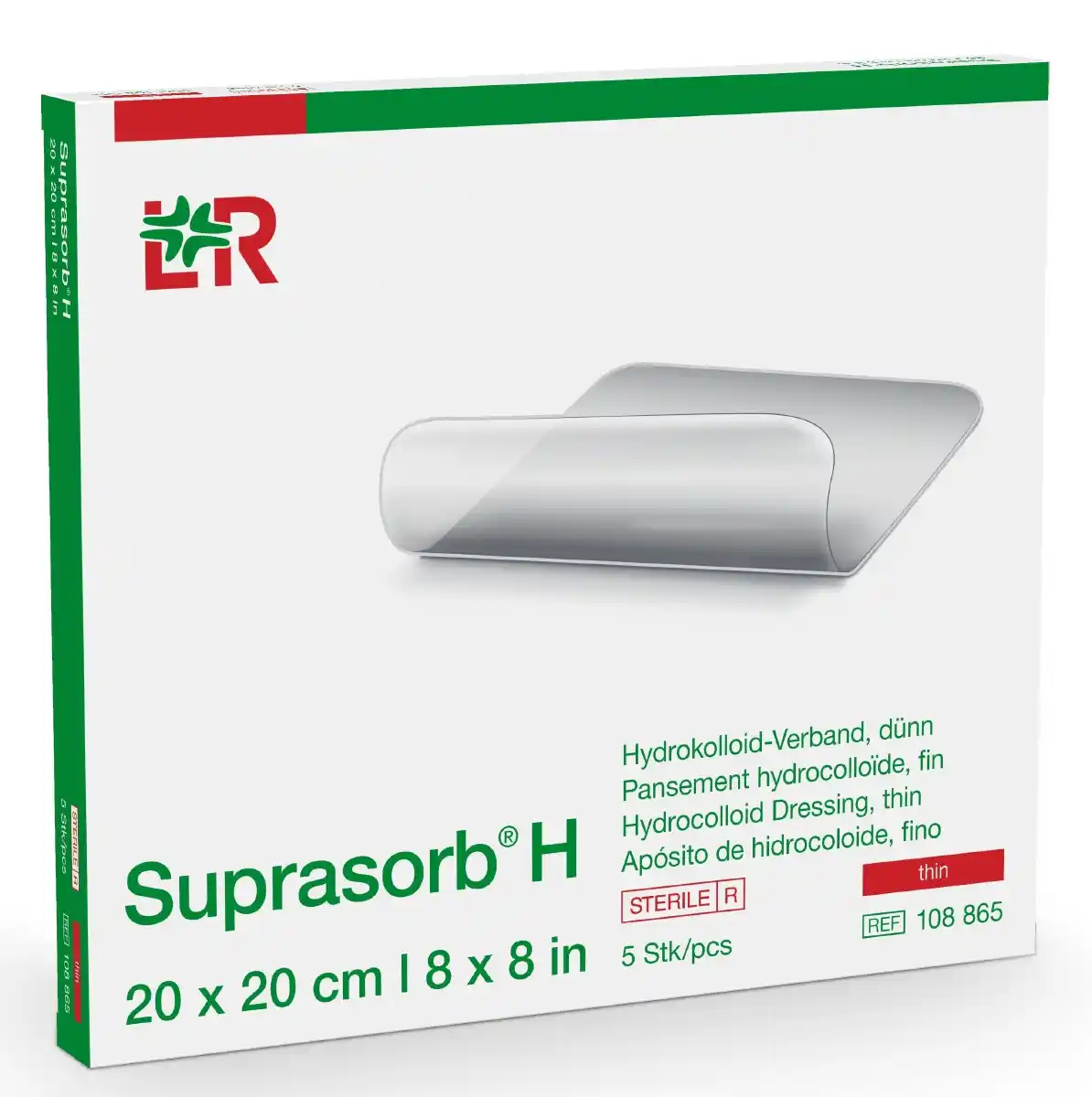 Der Suprasorb H Hydrokolloid-Verband besteht aus einer absorbierenden Hydrokolloid-Matrix, die auf eine atmungsaktive Polyurethan-Trägerfolie aufgebracht ist. Die Hydrokolloid-Matrix absorbiert Exsudat schnell und bildet ein kohäsives Gel. Zusätzlich zur ausgezeichneten Absorptionsfähigkeit bietet die atmungsaktive Polyurethan-Trägerfolie eine hohe Wasserdampfdurchlässigkeit. Die Kombination dieser Eigenschaften gewährleistet eine optimale feuchte Wundumgebung, minimiert das Risiko für Schädigungen der gesunden Wundumgebungshaut und bietet eine Tragezeit von bis zu sieben Tagen. Aufgrund der verschiedenen Ausführungen von Suprasorb H (Standard, Dünn, Sakrum, Border) können verschiedene Indikationen versorgt werden.