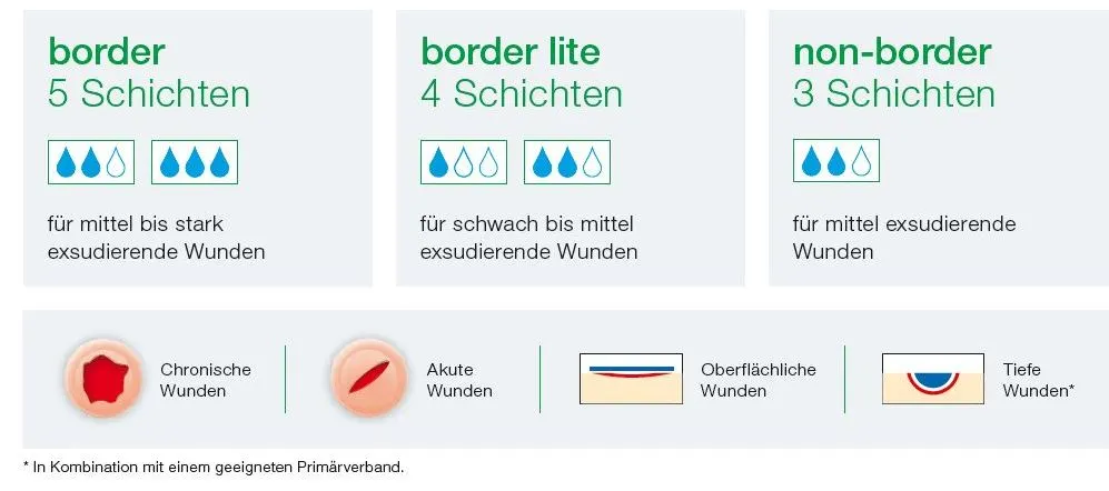 Suprasorb P sensitive ist je nach Exsudatmenge in drei Ausführungen erhältlich: „border“, „border lite“ und „non-border“