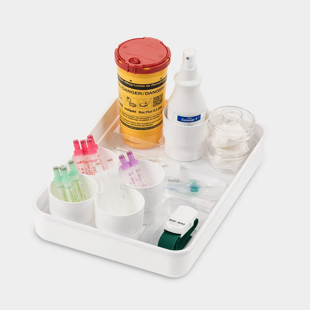 mit Tablett-Einsatz 1 Kanülensammelbox 6 Blutröhrchenbecher 2 Utensilienbecher rund und 1 Tupferbecher mit Deckel Außenmaße: L 433 x B 253 x H 55 mm