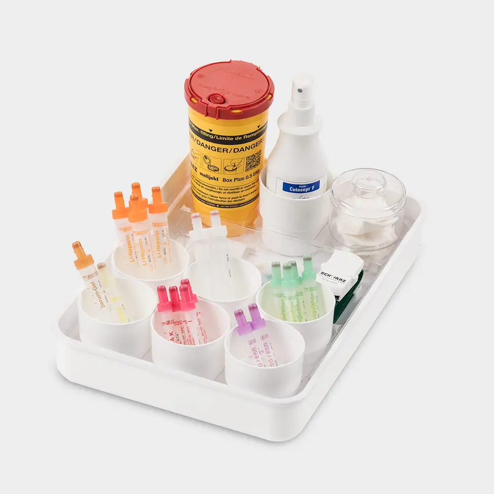 mit Tablett-Einsatz 1 Kanülensammelbox 6 Blutröhrchenbecher 1 Utensilienbecher rund und Tupferbecher mit Deckel Außenmaße: L 353 x B 253 x H 55 mm