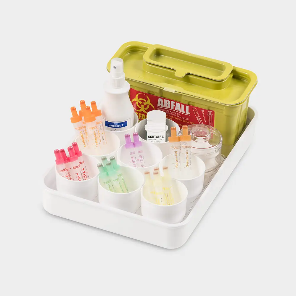 mit Tablett-Einsatz 1 Kanülensammelbox 6 Blutröhrchenbecher 2 Utensilienbecher rund und 1 Tupferbecher mit Deckel Außenmaße: L 353 x B 253 x H 55 mm