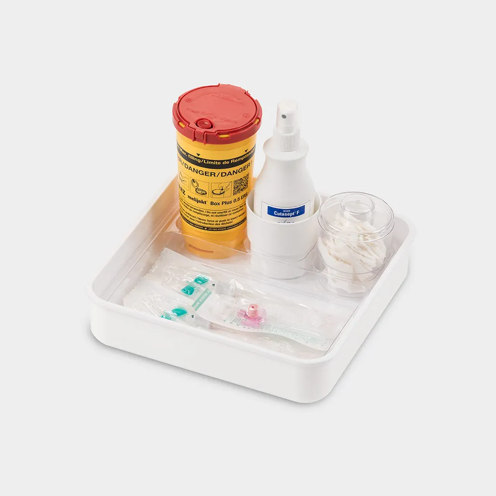 mit Tablett-Einsatz 1 Kanülensammelbox 2 Utensilienbecher rund und 1 Tupferbecher mit Deckel Außenmaße: L 253 x B 253 x H 55 mm