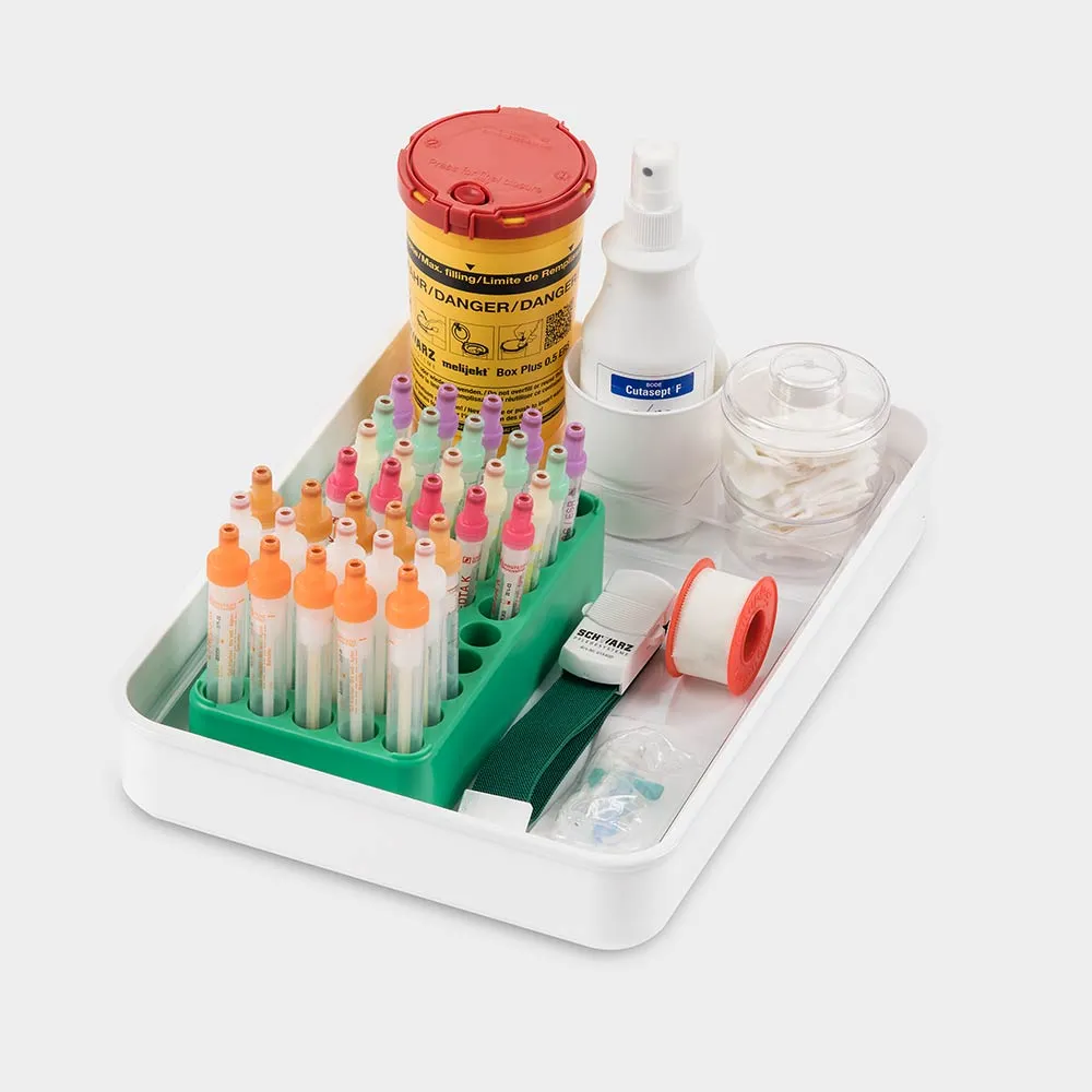 mit Tablett-Einsatz 1 Kanülensammelbox 2 Utensilienbecher rund und 1 Tupferbecher mit Deckel Außenmaße: L 433 x B 253 x H 55 mm