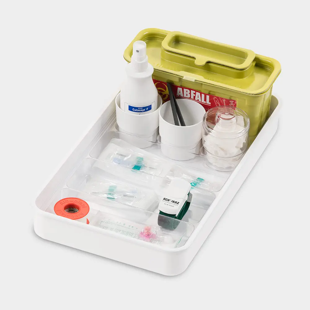 mit Tablett-Einsatz 1 Kanülensammelbox 2 Utensilienbecher rund und 1 Tupferbecher mit Deckel Außenmaße: L 433 x B 253 x H 55 mm