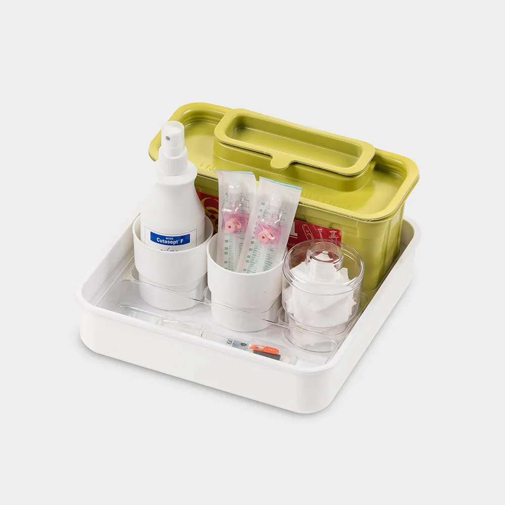 mit Tablett-Einsatz 1 Kanülensammelbox 2 Utensilienbecher rund und 1 Tupferbecher mit Deckel Außenmaße: L 253 x B 253 x H 55 mm