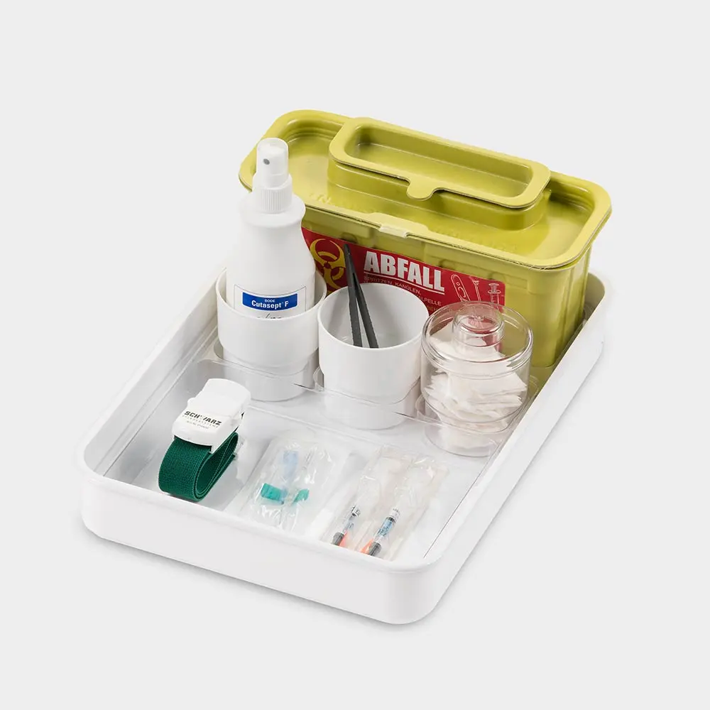 mit Tablett-Einsatz 1 Kanülensammelbox 2 Utensilienbecher rund und 1 Tupferbecher mit Deckel Außenmaße: L 353 x B 253 x H 55 mm