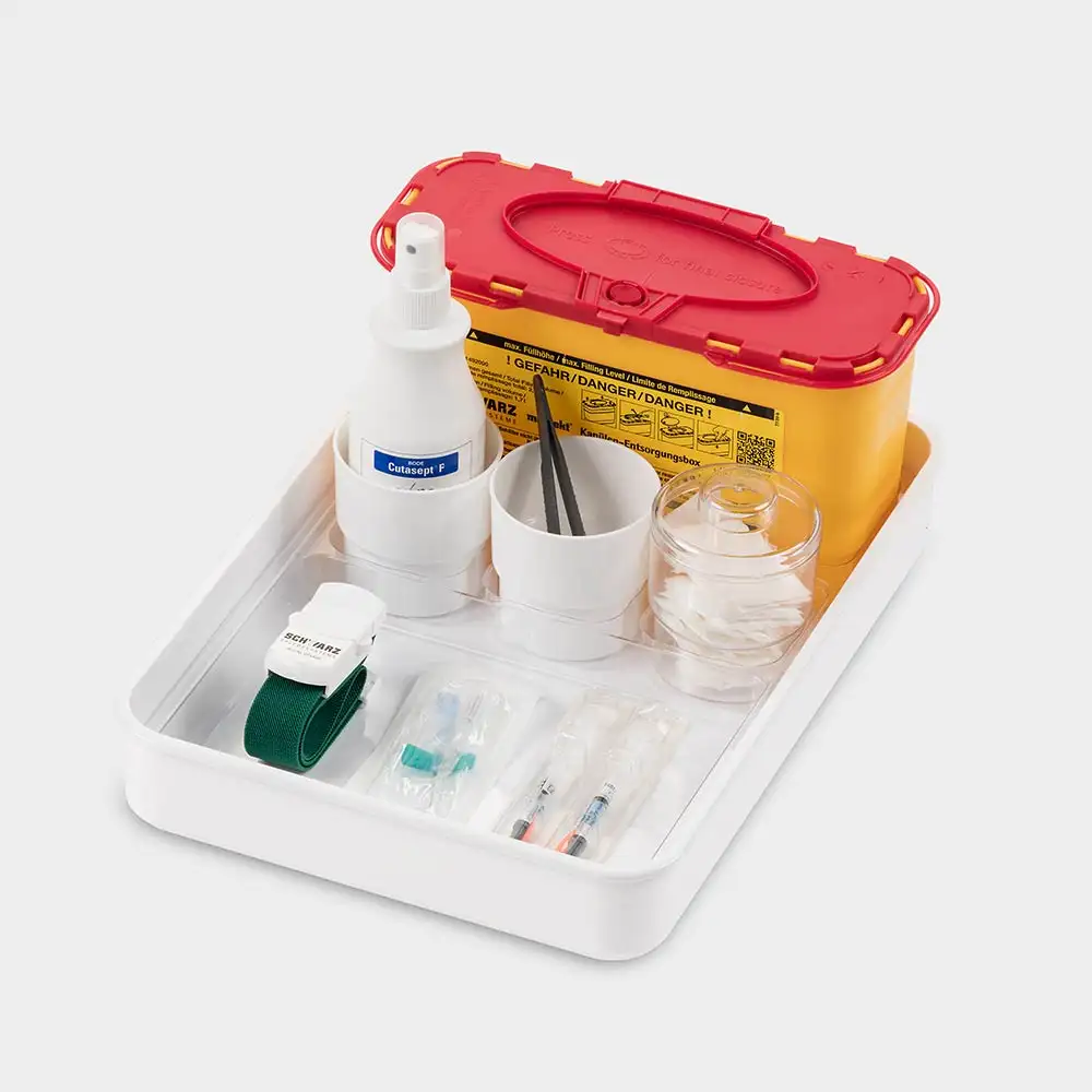 mit Tablett-Einsatz 1 Kanülensammelbox 2 Utensilienbecher rund und 1 Tupferbecher mit Deckel Außenmaße: L 353 x B 253 x H 55 mm