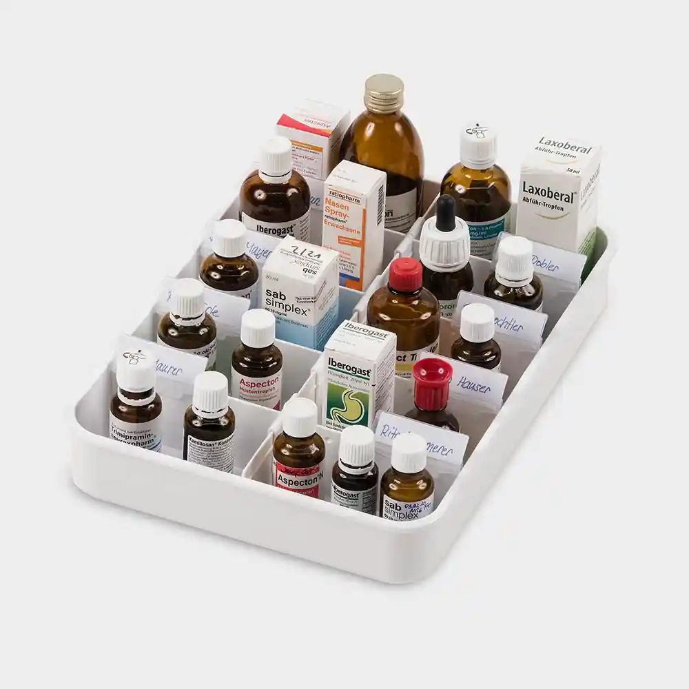 bewohnerbezogene Aufbewahrung der Anbruchtropfen - variables Teilersystem mit Beschriftungsschild Außenmaße: L 353 x B 253 x H 55 mm