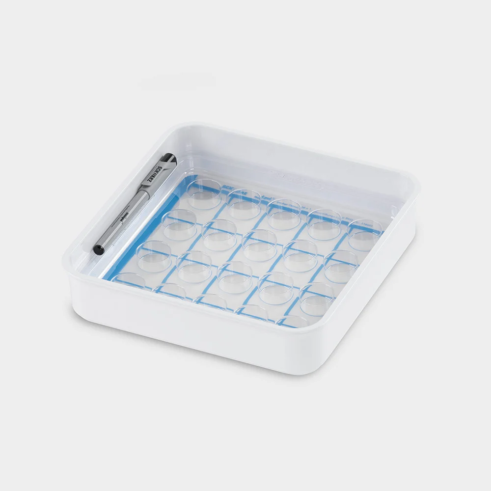 mit Tablett-Einsatz für 20 Becher Tabletten oder Tropfen Beschriftungsfolie und Folienstift Maße: L 253 x B 253 x H 55 mm