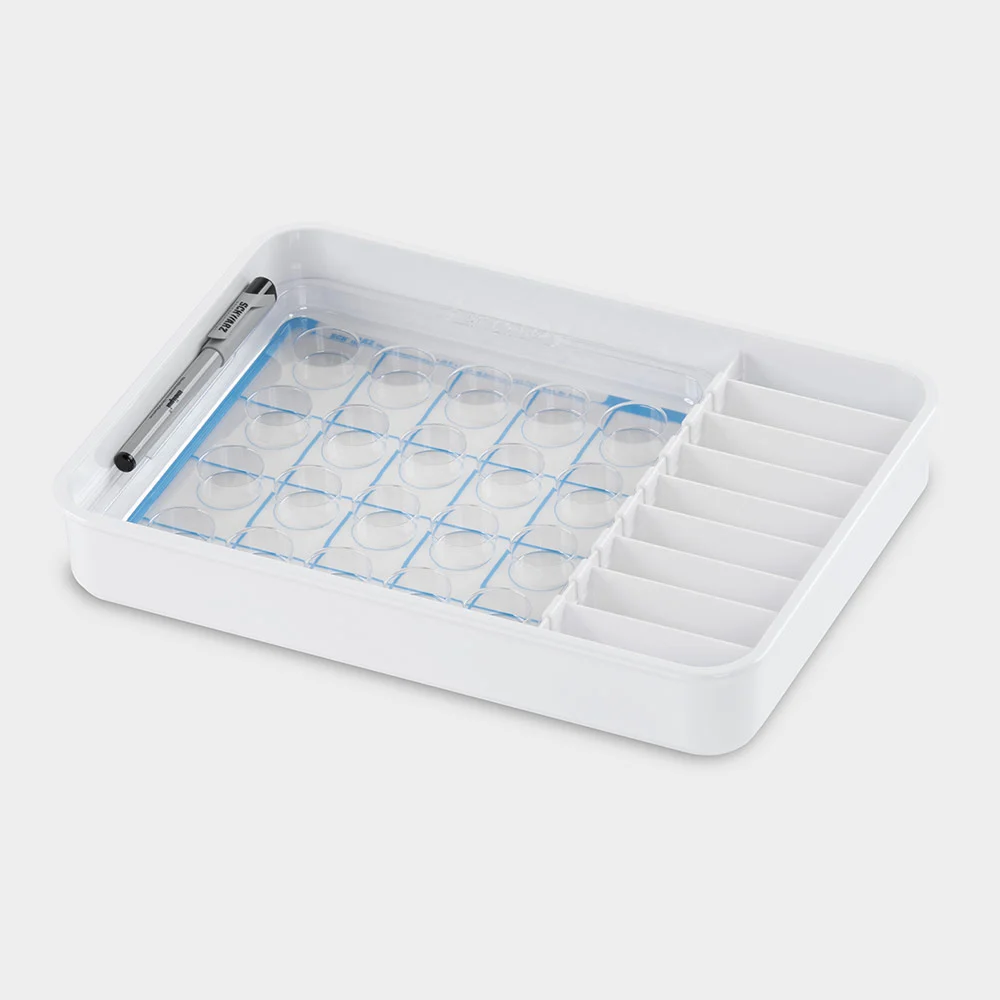 mit Tablett-Einsatz für 20 Becher Tabletten oder Tropfen und Pulver-Tütchen Beschriftungsfolie verschiebbarem Teilersystem und Folienstift Maße: L 353 x B 253 x H 55 mm